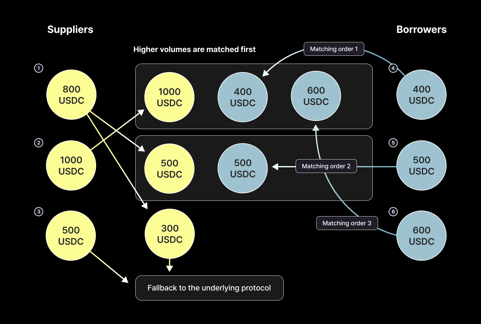 Unmatched amounts of supply 1 (300 USDC) and supply 3 (500 USDC) fall back to the underlying protocol.