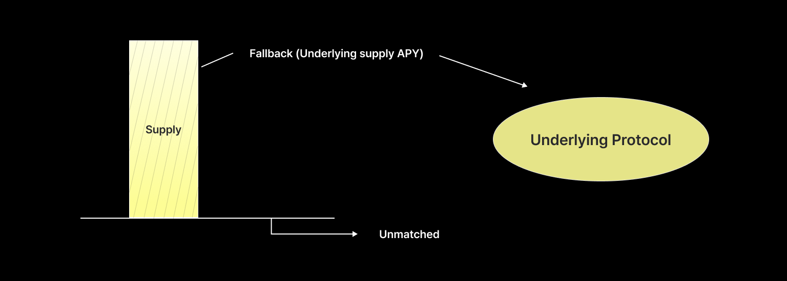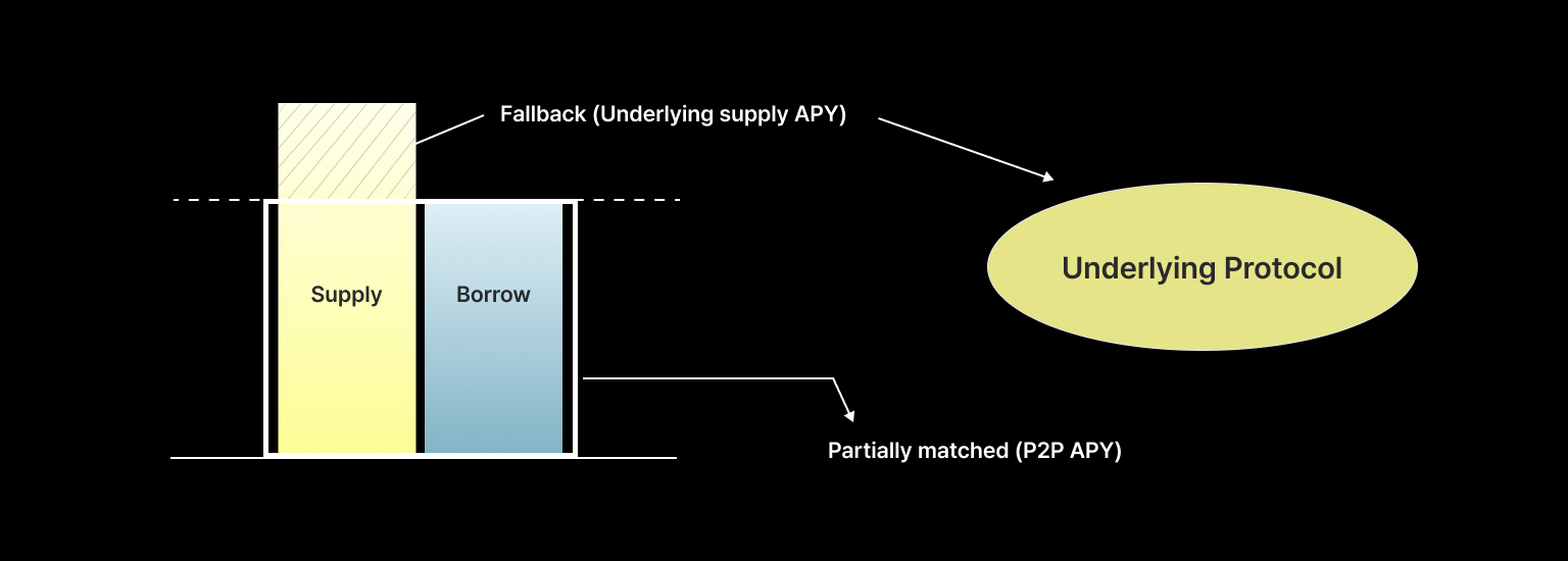 If there are borrowers but not enough to fill the supplier's entire order, the matching engine partially matches their funds. The unmatched portion is supplied to the underlying protocol. The supplier enjoys a P2P APY on the matched portion and the underlying protocol's APY on the remaining funds.